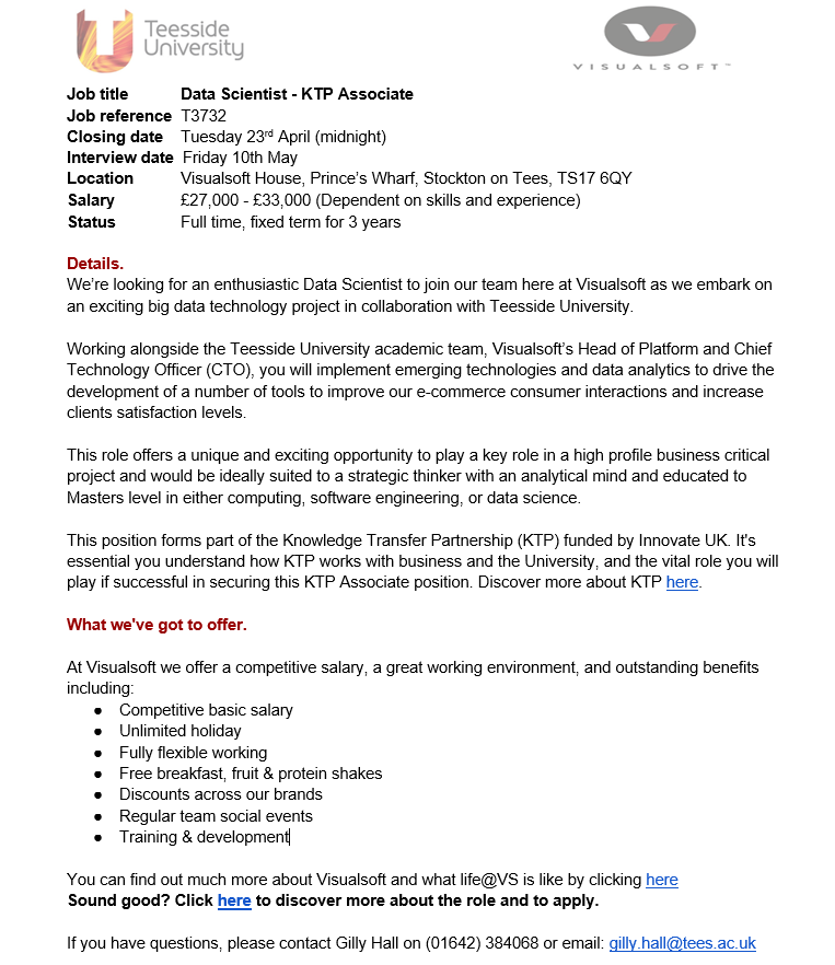 Teesside University Together With Business On Twitter Fantastic Graduate Job Opportunity For A Data Scientist At Visualsoft Ltd Amp Teesside University Closes 23rd April 2019 27 33k Ktp Gradjobs To Discover More About